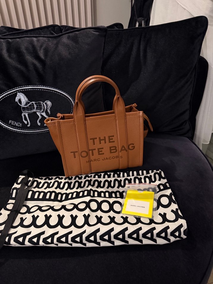 Taba deri çanta, tokalı ve baskılı detaylara sahip, trend sokak stili için uygun. Üzerinde "THE TOTE BAG" yazısı bulunur.