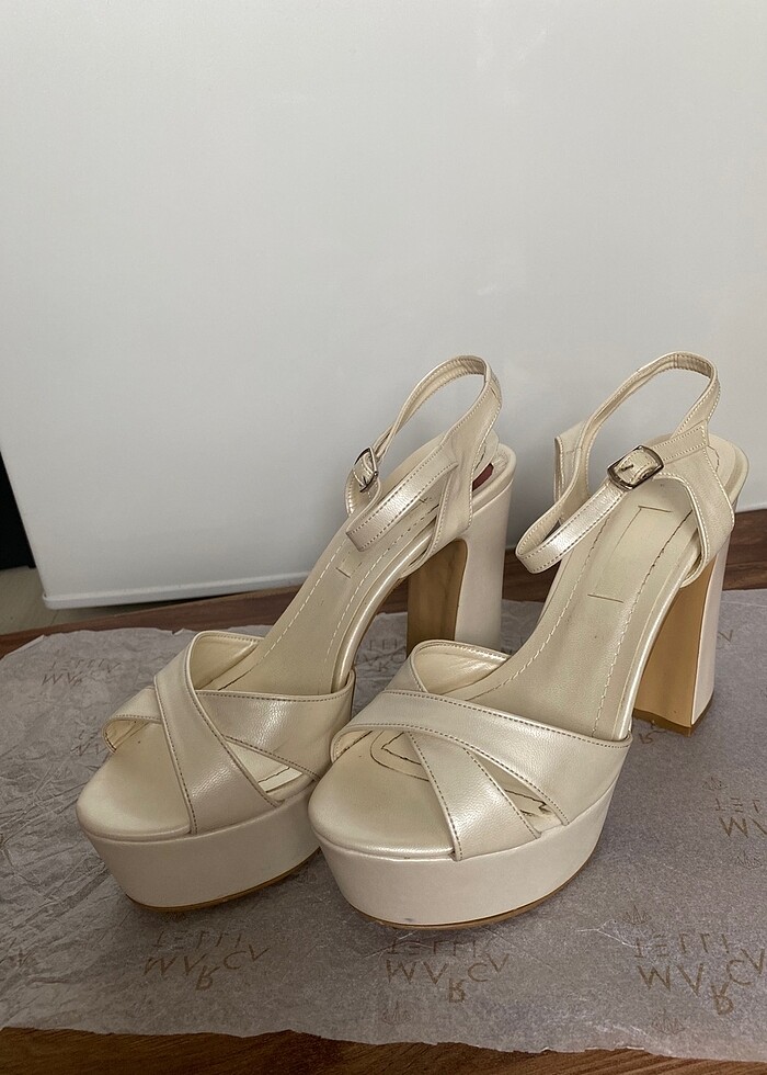 Sadece 1 kez düğünde giyilmiştir. Rengi sedef rengidir. Topuk boyu: 12,5 cm. Kutusu ve özel çantalarıyla gönderim yapılacaktır.