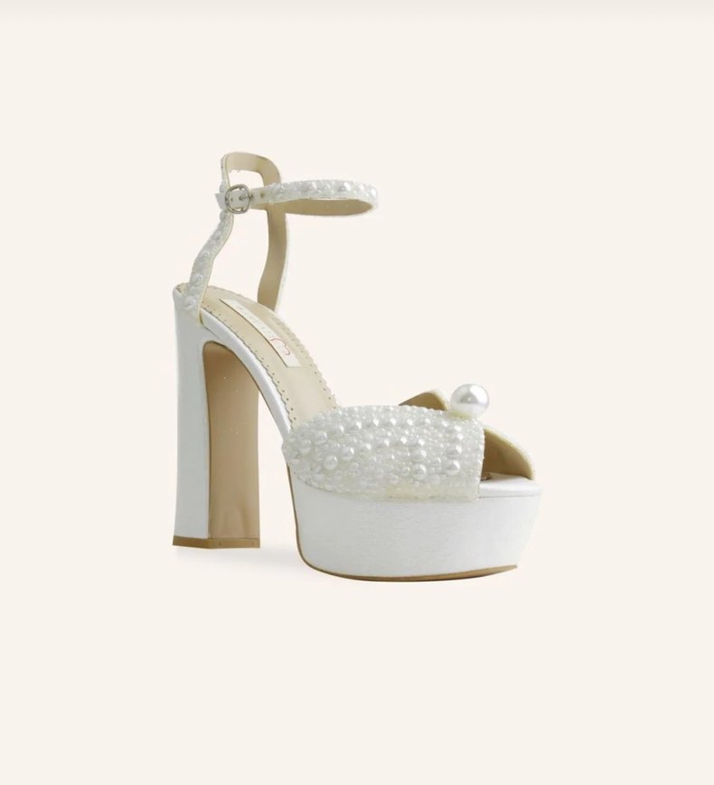 İnci ve nakış detaylı, dantelli beyaz platform topuklu ayakkabılar, ipeksi dokusu ve bohem tarzıyla şık ve göz alıcı bir gelinlik seçeneği. 13 cm topuk boyu. Düğünümde giydim sadece bir topuklunun altında isim yazıyor diğeri boş ve arka kısmı hafif pembe ama temizlenir benim satmam gerektiği için hemen koydum