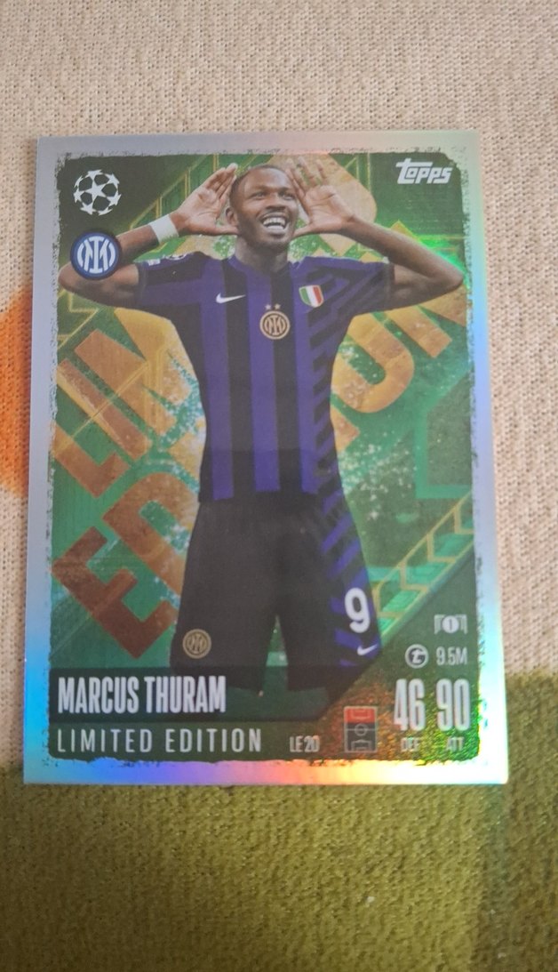 Sınırlı baskı Marcus Thuram futbol kartı, canlı koyu tasarımla. İstatistikleri ve takım logosu holografik detaylarla öne çıkıyor. ⚽