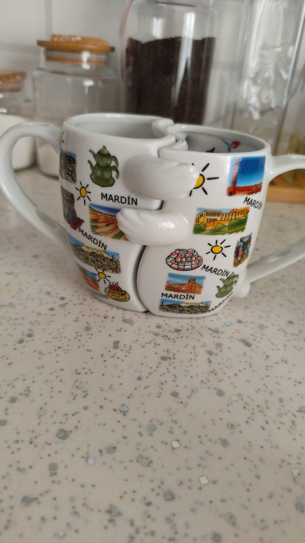 Mardin temalı renkli illüstrasyonlara sahip beyaz porselen kupa seti. Kulp tasarımı birbirine geçmeli ve ilgi çekici.bir birinden ayrılan iki kupadir ☕
