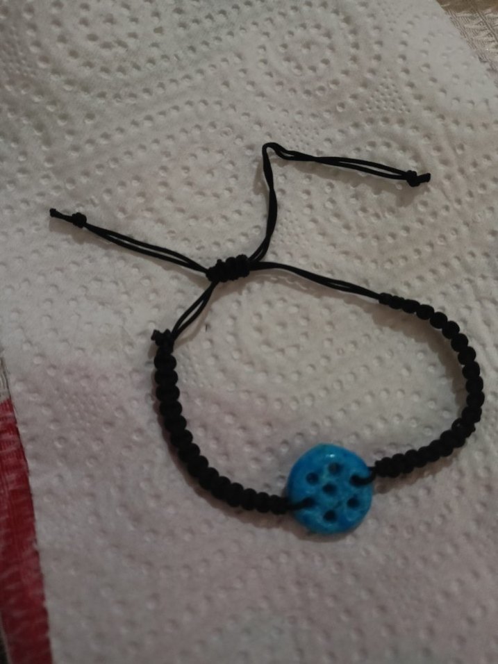 Kadın bilekliği, siyah ip ve turkuaz desenli merkez parçaya sahiptir. Ayarlanabilir ip ile rahat kullanım sağlar, minimalist ve bohem tarzına uygundur. Mardinden alınmıştır.