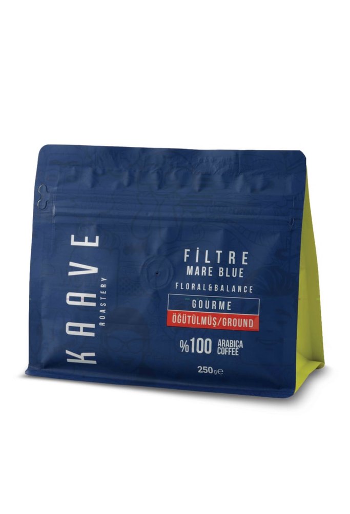 Mare Blue öğütülmüş kahve, floral denge aromalı, mavi kilitli torbada 250 gram %100 Arabica kahve içerir. ☕