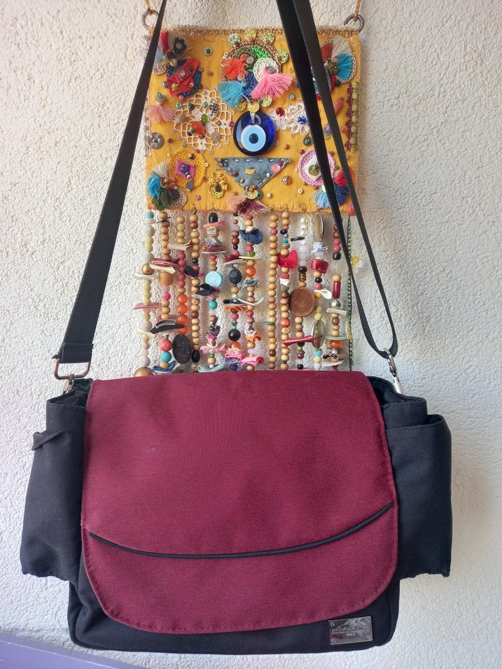 Bordo ve siyah renklerde, büyük kapaklı ve yan cepli bebek bakım çantası, temel eşyaları taşıma için uygundur.