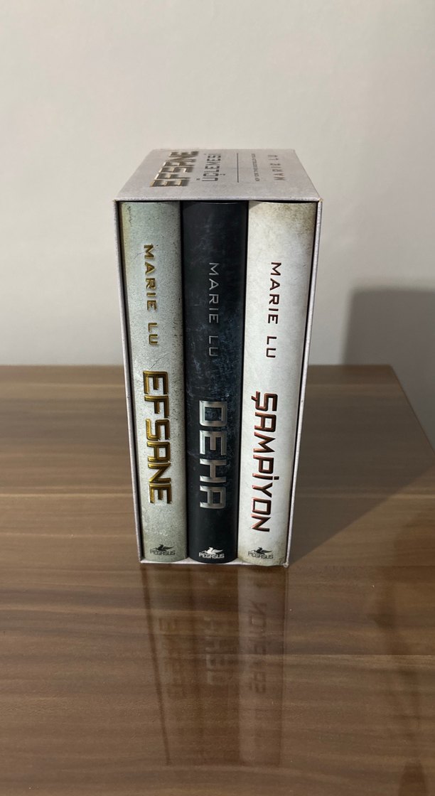 Marie Lu'nun Efsane, Deha ve Şampiyon romanlarından oluşan üçleme kutu seti, sağlam bir kutu içinde sunuluyor.