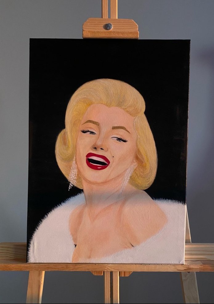 Siyah arka planda, parlak beyaz kürk detaylı Marilyn Monroe portresi. 35*50 Akrilik Boya Çizimidir.