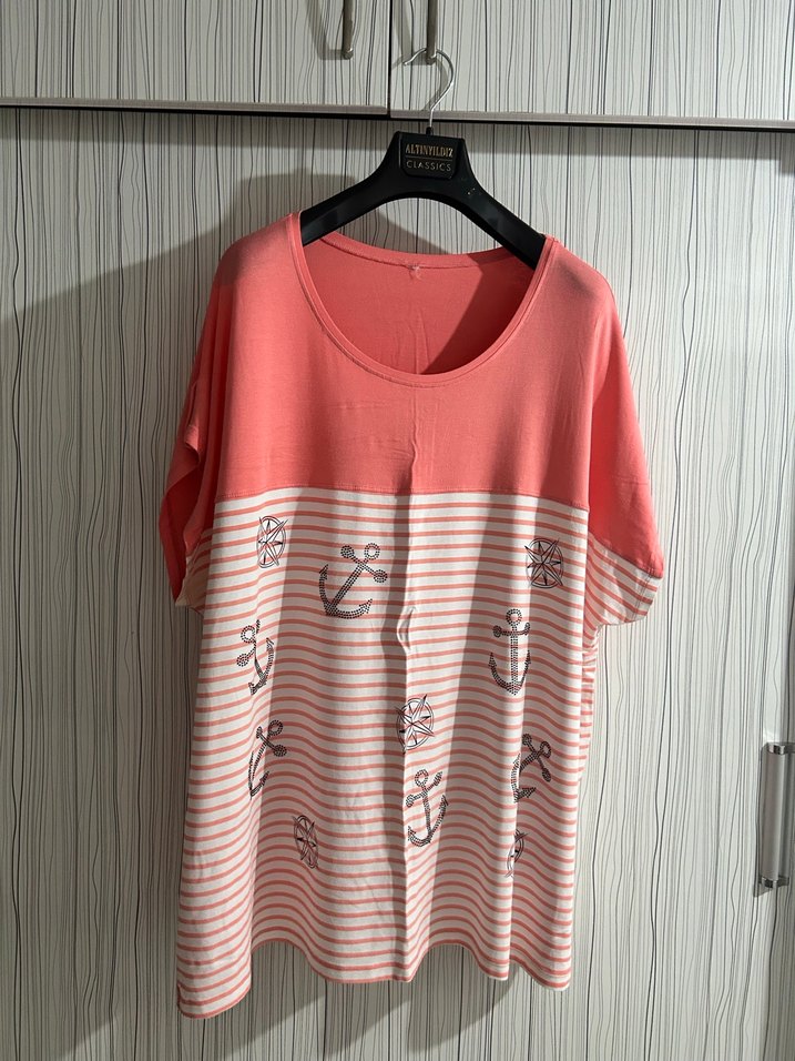 Pamuk bluz, kısa kollu, yuvarlak yakalı ve düğmeli detaylı. Çizgili ve çapa baskılı deseniyle rahat ve şık sokak stili için uygun.