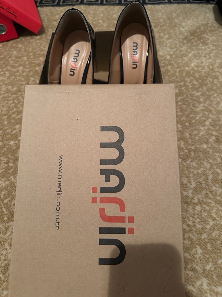 Marjin markasına ait kahverengi stiletto topuklu ayakkabı, tokalı ve desenli tasarıma sahip, günlük iş kullanımı için uygundur. Kauçuk malzeme dayanıklılık sağlar.
