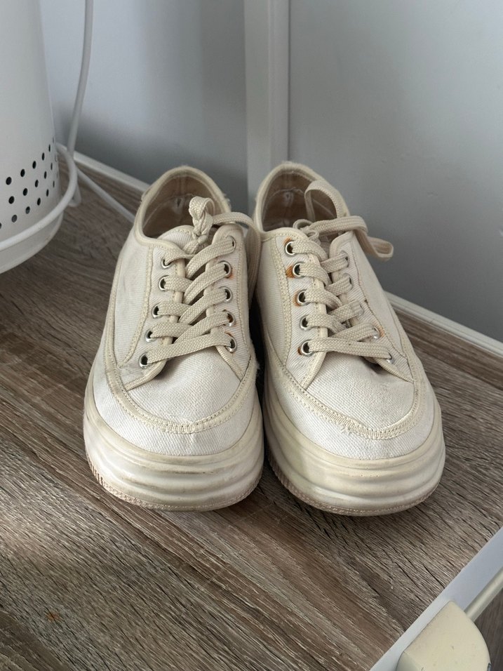 bej krem arası renk, kauçuk malzemeden platform topuklu kadın snekar ayakkabı. Minimalist tasarımıyla günlük ve sokak stiline uyum sağlar.