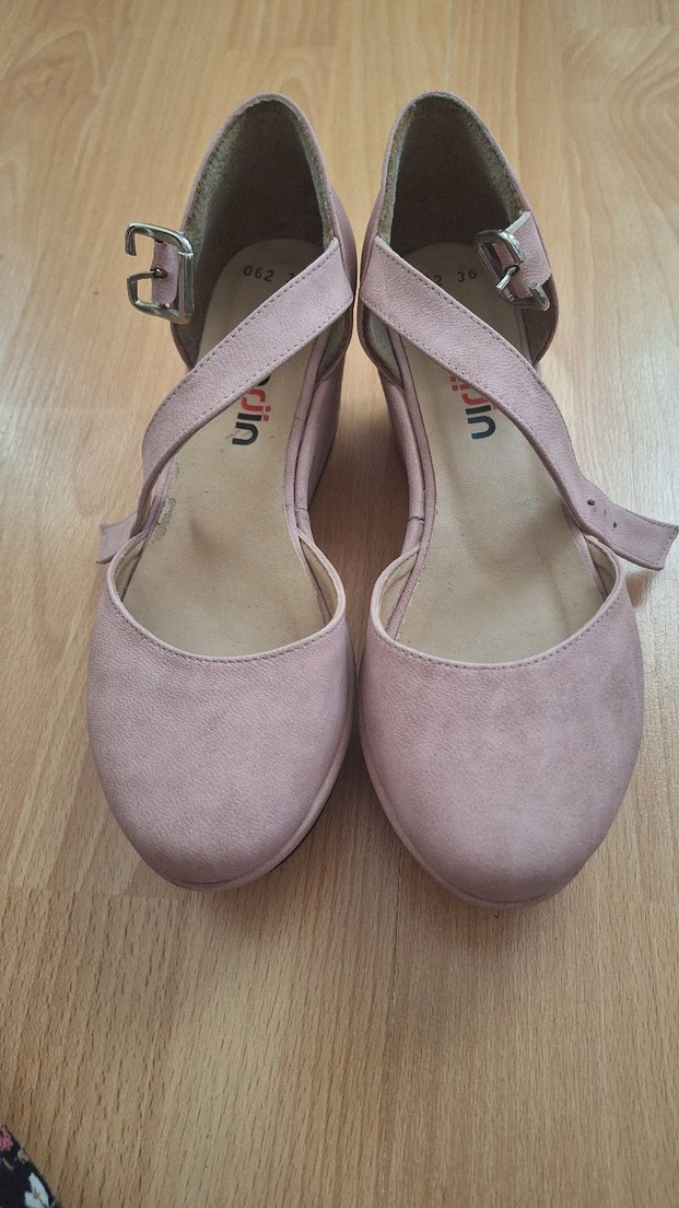 Pembe süet dolgu topuklu kadın ayakkabıları, tokalı kayış ve minimalist tasarım ile günlük kullanıma uygundur. Düz yüzeye sahiptir. Herhangi bir defosu yoktur.