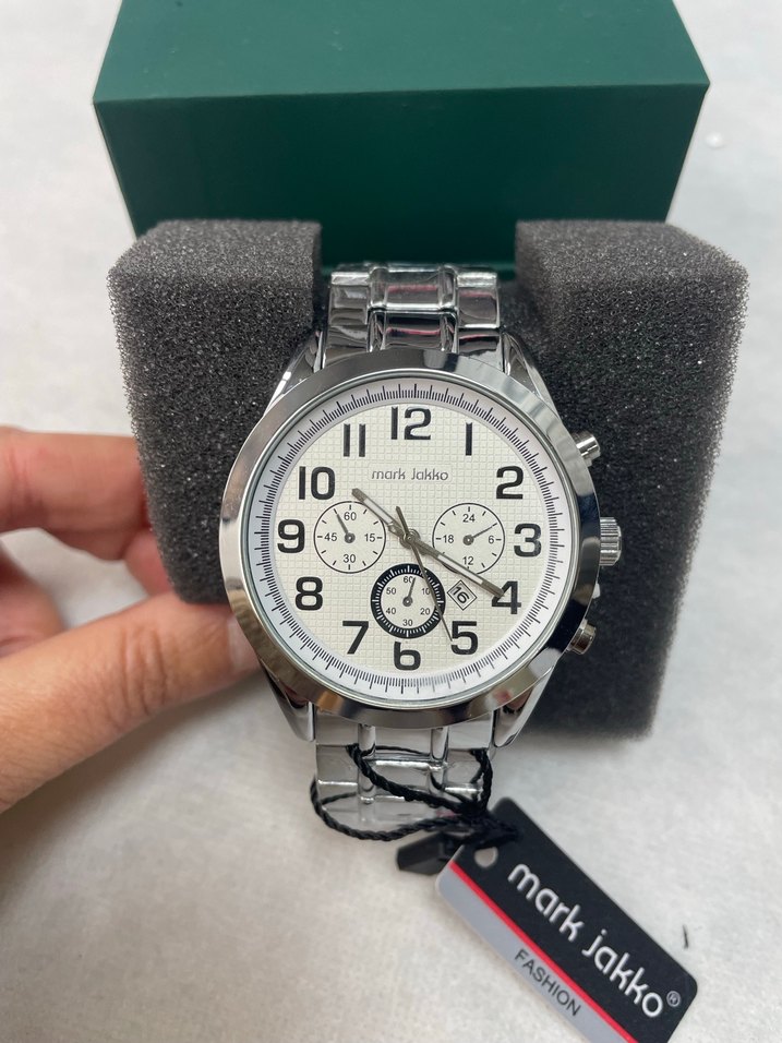 Mark Jakko erkek saati, beyaz kadran ve net siyah rakamlarla klasik tasarımı gri metal kayışla buluşturuyor. ⌚