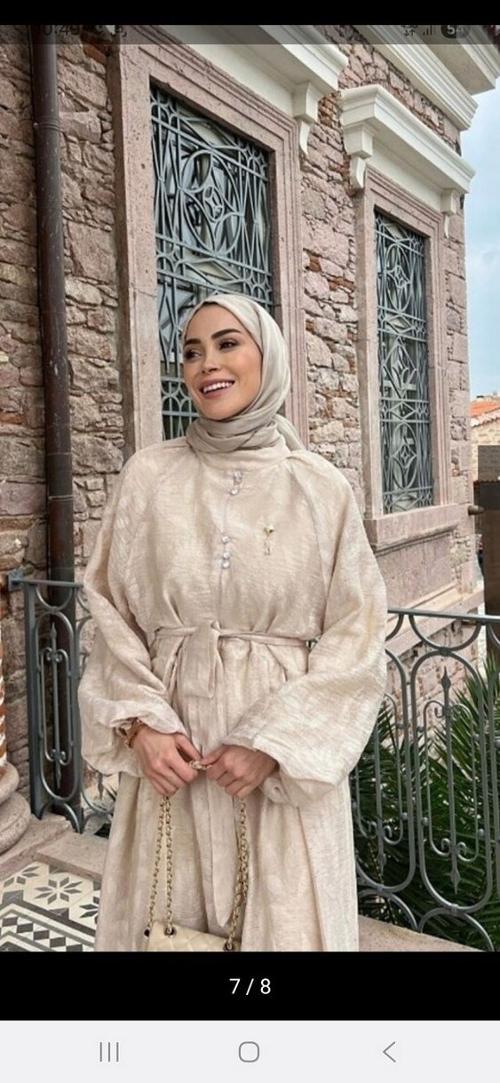 Bej renkli, yüksek yakalı ve uzun kollu bu uzun elbise, salaş kesim ve drapeli tasarıma sahiptir. İpek gibi kumaştan üretilmiş, etnik desenlidir ve günlük abiye kullanım için uygundur. bir kere kullanıldı çok rahat ve hiç ütü istemeyen şık bir parça