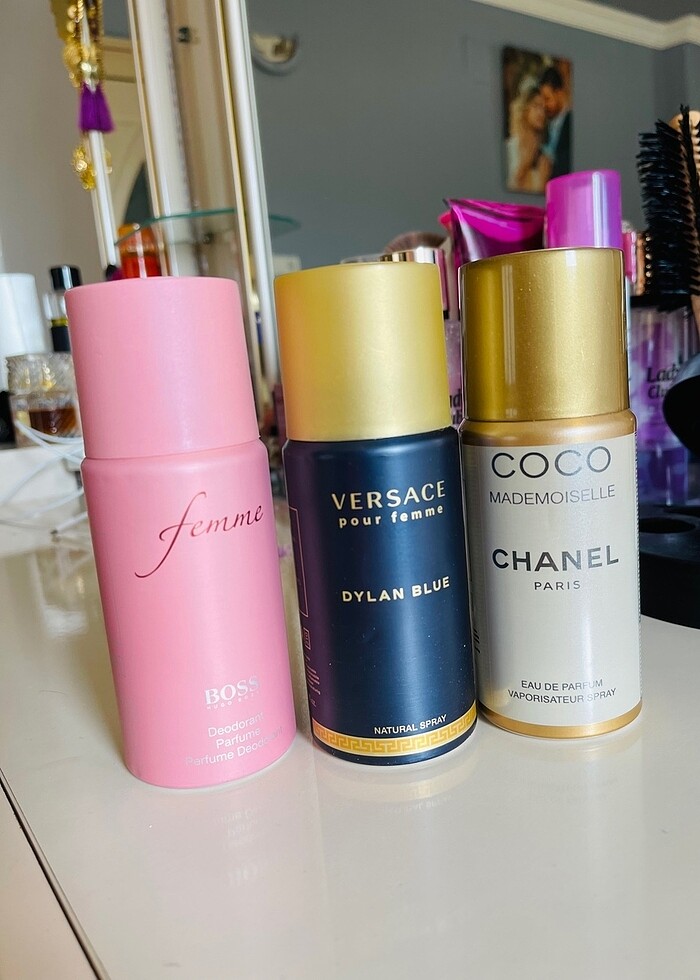 Chanel coco. Versace pour femme.hugo boss femme iki kadın kokusu bir erkek kokusu deodorantlar kalıcı koku bir ilan fiyatıdır tekli verilmemektedir 150 ml hepsi aynı boyut