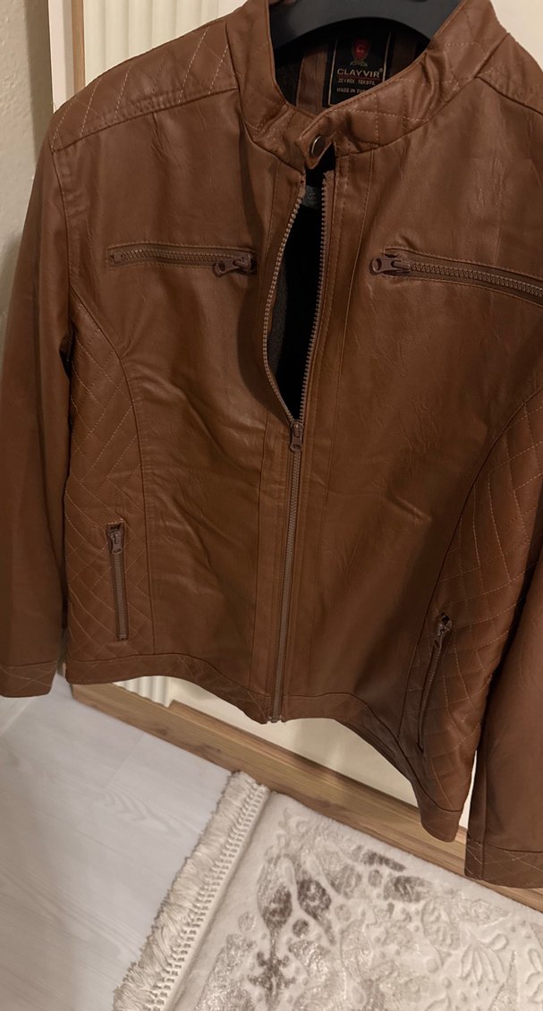 Kahverengi, parlak deri biker ceket, fermuarlı cepler ve yakalı tasarıma sahiptir. Sıkı kesim ve askılı kollarla günlük sokak stiline uygundur.