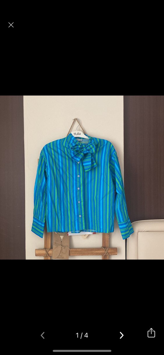 Uzun kollu, yakalı ve düğmeli kadın gömleği. Gevşek kesim ve kısa boy, pastel mavi çizgili desende, rahat sokak giyimi için uygun.