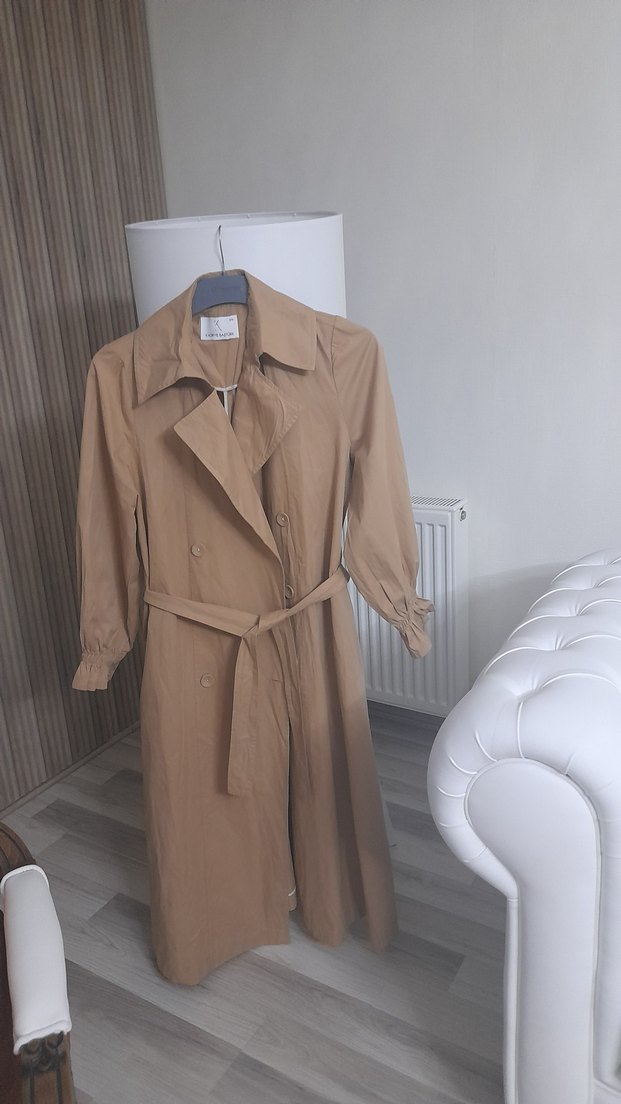Bej renkli, uzun kesim, kemerli kadın trençkot. Notch yaka ve askılı kolları bulunur. Günlük kullanıma uygun, sentetik kumaştan yapılmıştır.