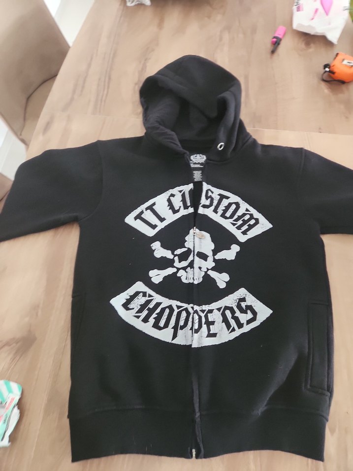 Siyah sweatshirt, bol kesim, uzun kollu ve bisiklet yaka. Fermuarlı ön ve baskılı biker deseni, yumuşak kumaştan, günlük kullanım için uygun. ☠️ tt custom. Harika durumdadir. resimlerde rengi soluk cikiyor ama gayet canli bir renge sahiptir.