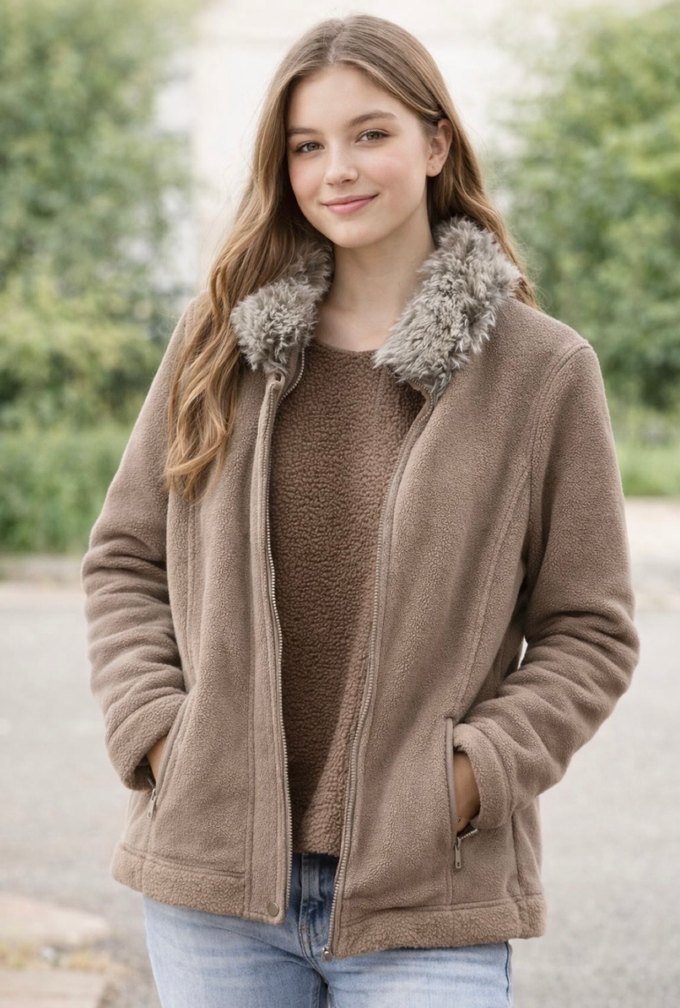 Yumuşak polar kumaştan yapılmış, kürk yakalı bej sıcak tutan kadın ceketi. Rahat kesim, uzun kollu ve normal boyda sokak stili için uygun.