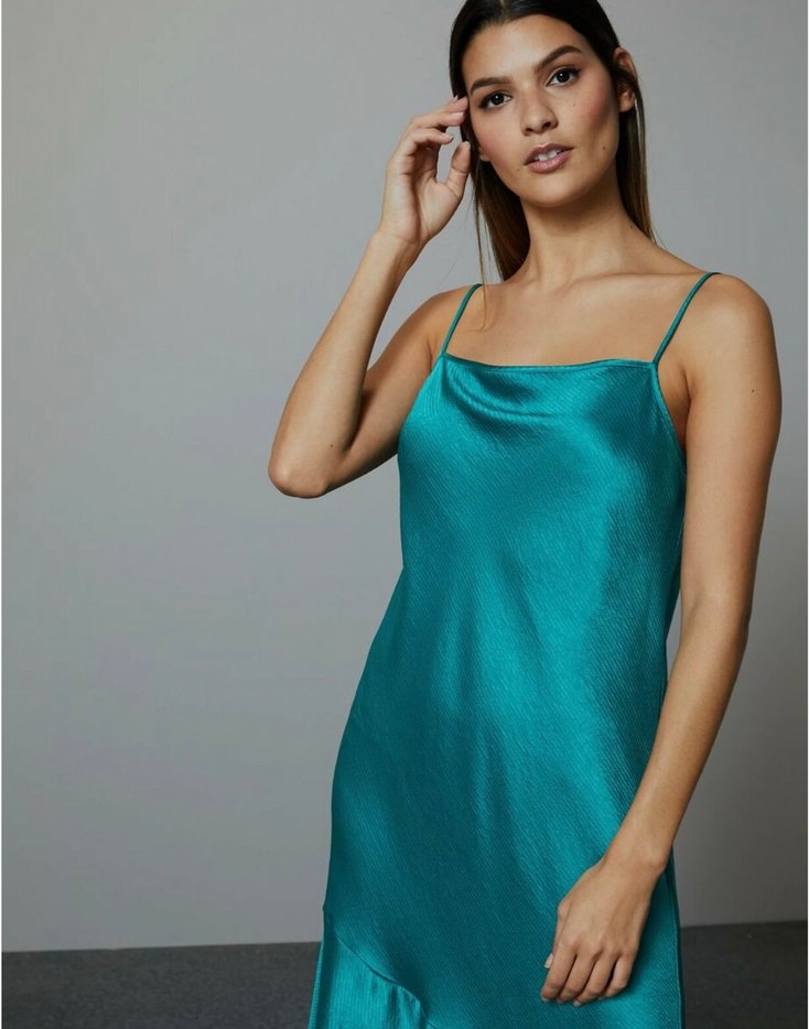Uzun askılı elbise, drapeli tasarımı ve turkuaz/koyu yeşil rengiyle dikkat çeker. Yumuşak sentetik kumaştan üretilmiş, bol kesim ve çağdaş minimalist tarz sunar. Marks&Spencer Autograph koleksiyonu ürünüdür. #kokteylelbisesi #düğünelbisesi #gecekıyafeti #saten