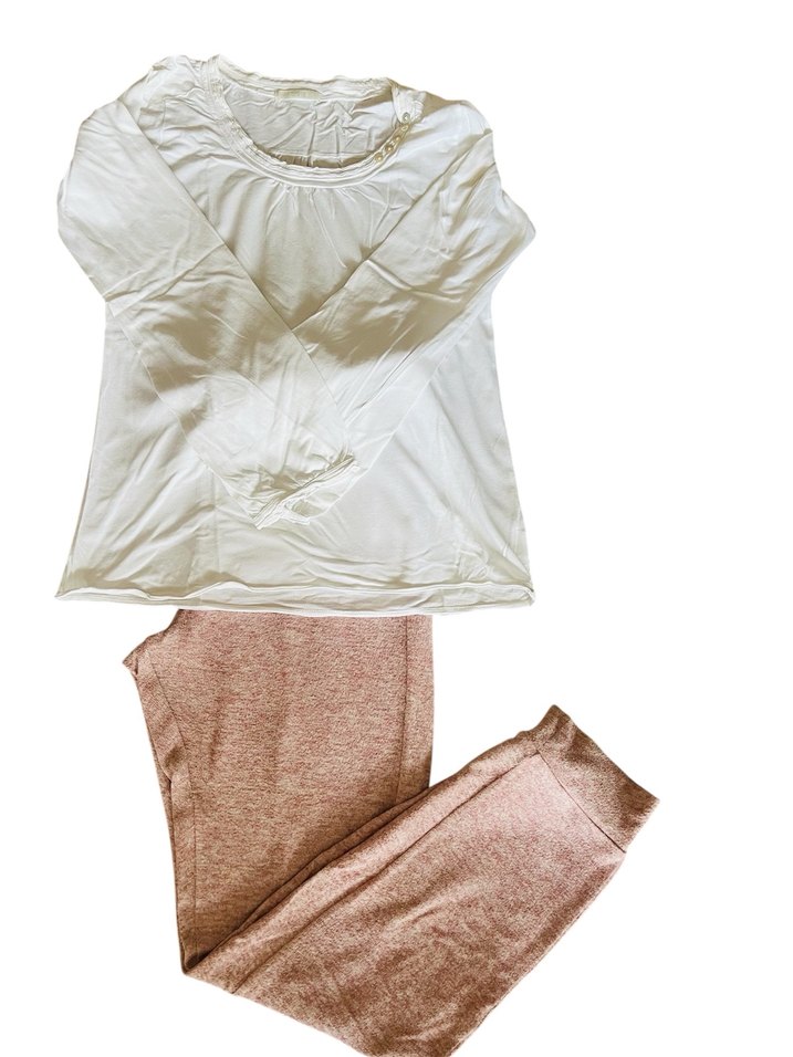 Üst beyaz renk uzun kollu marks& Spencer marka penye M beden . Üstü desensiz, altı yumuşak ve rahat kırçıllı pembe renk S beden polar farklı bir markadır.İkisi takım değildir ben takım yaptım.Alt ve üst S-M beden uyumludur