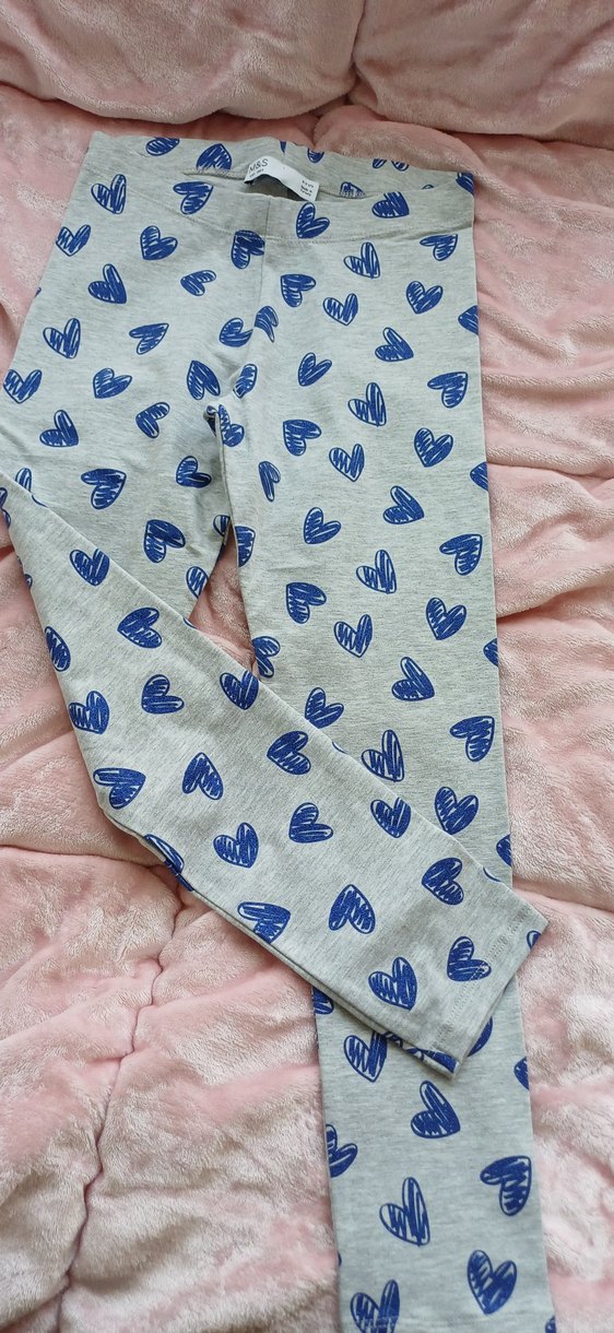 Hiç giyilmemistir. Gri tabanlı, mavi kalp baskılı, pamuklu örgü kumaştan yapılmış, kız çocuk taytı, rahat ve trend bir görünüm sunar. 9-10 yaş #Tayt #pijama #patik #ayakkabı #terlik #havlu #kolye #lacoste #adidas #koton #nike #polo #uspa #polar #eşofman #kitap #oyuncak #lego #kazak