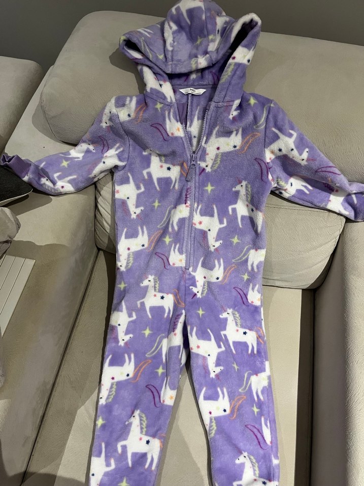 Kız çocuklar için mor renkte, fermuarlı ve kapüşonlu tulum. Yumuşak ve sıcak kumaştan, uzun kollu, unicorn desenli. Bir kez bile giyilmedi.