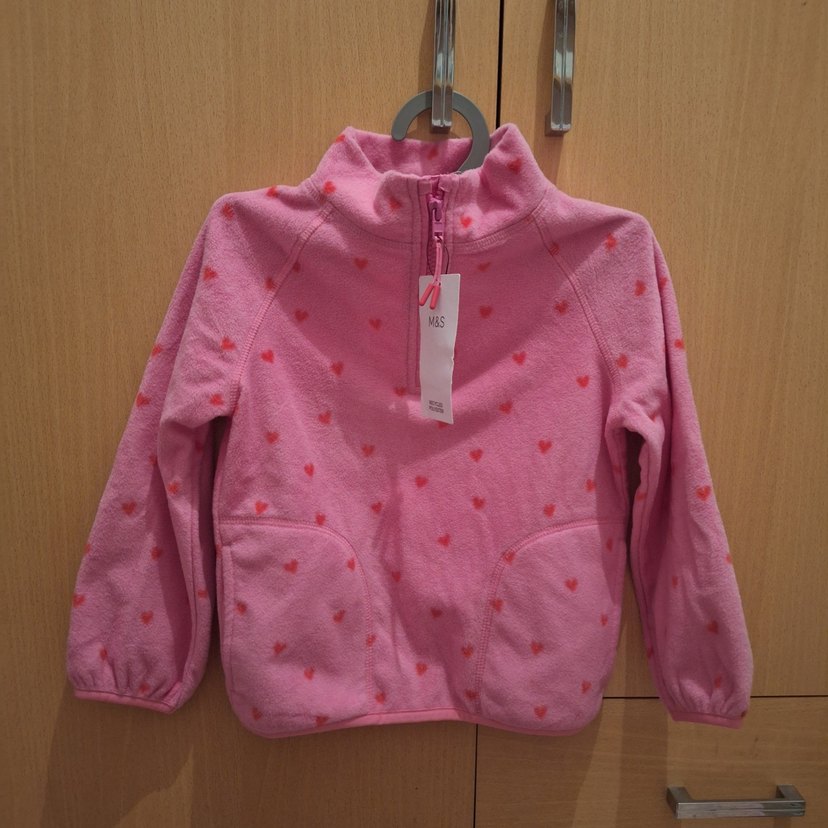 Pembe renkli, kalp desenli kız çocuk polar ceket. Fermuarlı, bol kesim ve yuvarlak yaka detaylıdır. Rahat ve günlük kullanıma uygundur. Sıfırdır, hiç kullanılmadı.