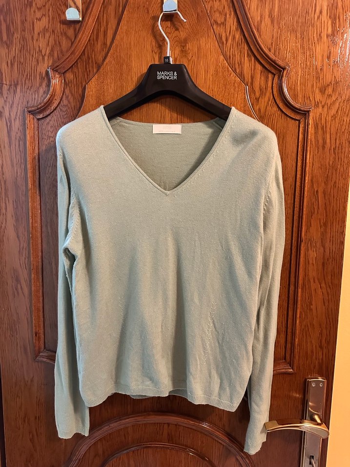 Marks & Spencer marka, açık yeşil renkte, kaşmir karışımlı, yumuşak kazak. Az giydim, kol ve ön kısmında ufak tüylenmeler oluştu. Kol altı: 44 cm Ense - etek boyu: 50 cm