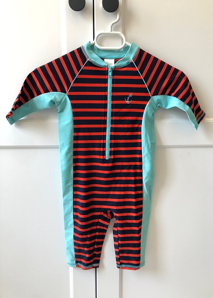 3-4 yaş 104 cm boy upf 40+ temiz, içi plaj kum var ve önde tüylenme var