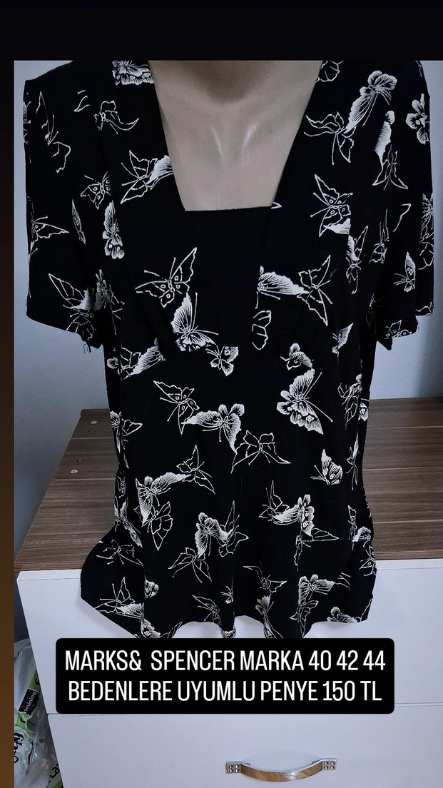 Marks & Spencer markalı, kısa boylu, V yaka ve kısa kollu siyah bluz. Desenli sentetik kumaştan, rahat kesimli, gündelik sokak stili için uygun. 40, 42, 44 beden uyumlu.