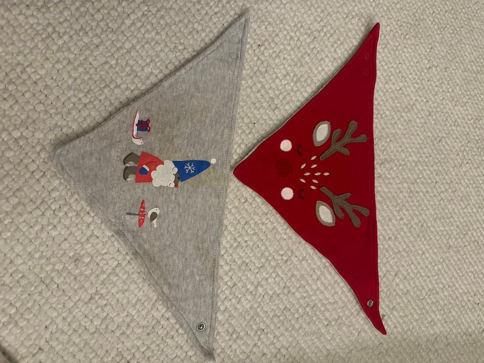 Yumuşak kumaştan, çıtçıtlı, nakışlı Noel Baba desenli gri bebek önlüğü.