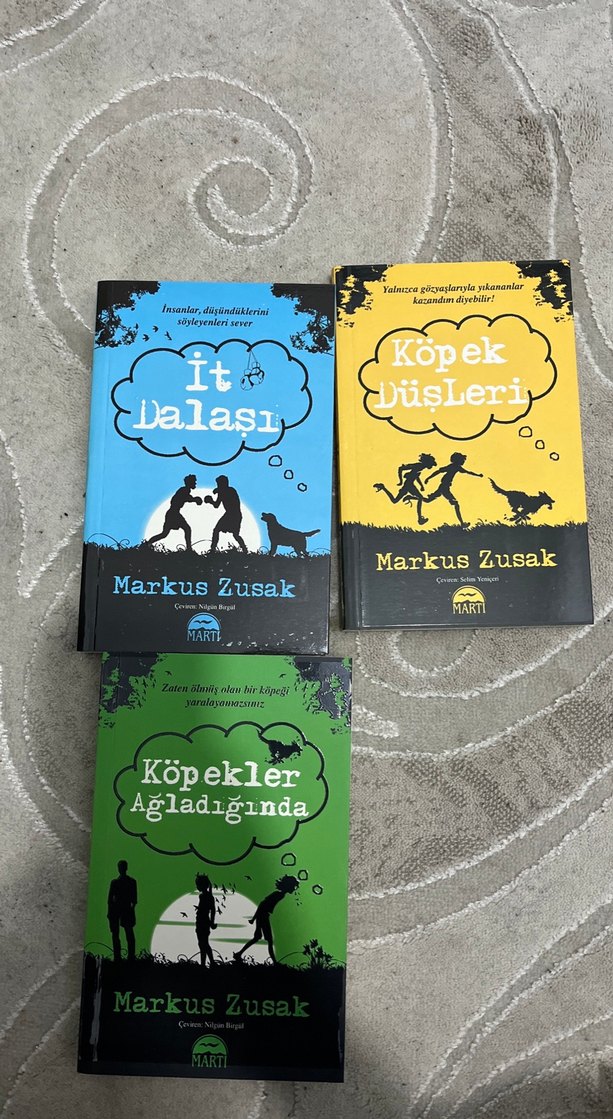 Markus Zusak'ın "It Lalaşı," "Köpek Dişleri" ve "Köpekler Ağladığında" adlı üç romanından oluşan set. Kitap kapaklarında silüetler ve düşünce balonları bulunur.