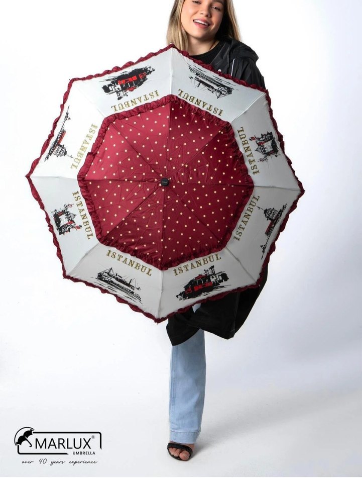 Bordo renkli, fırfırlı kenarlara sahip kadın şemsiyesi. Üzerinde 'Istanbul' yazısı ve çeşitli desenler bulunur. MARLUX markalı, klasik tasarım ☂️