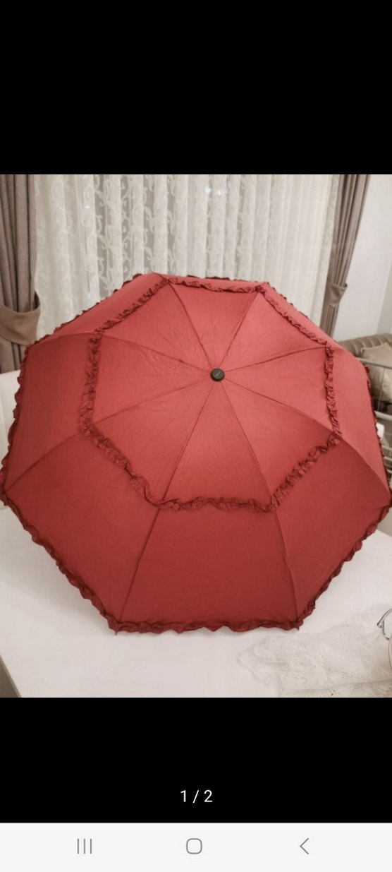Koyu kırmızı renkte, kenarlarında zarif fırfır detayları bulunan kadın şemsiyesi. Bohem Paris tarzını yansıtan vintage bir tasarıma sahiptir. ☂️