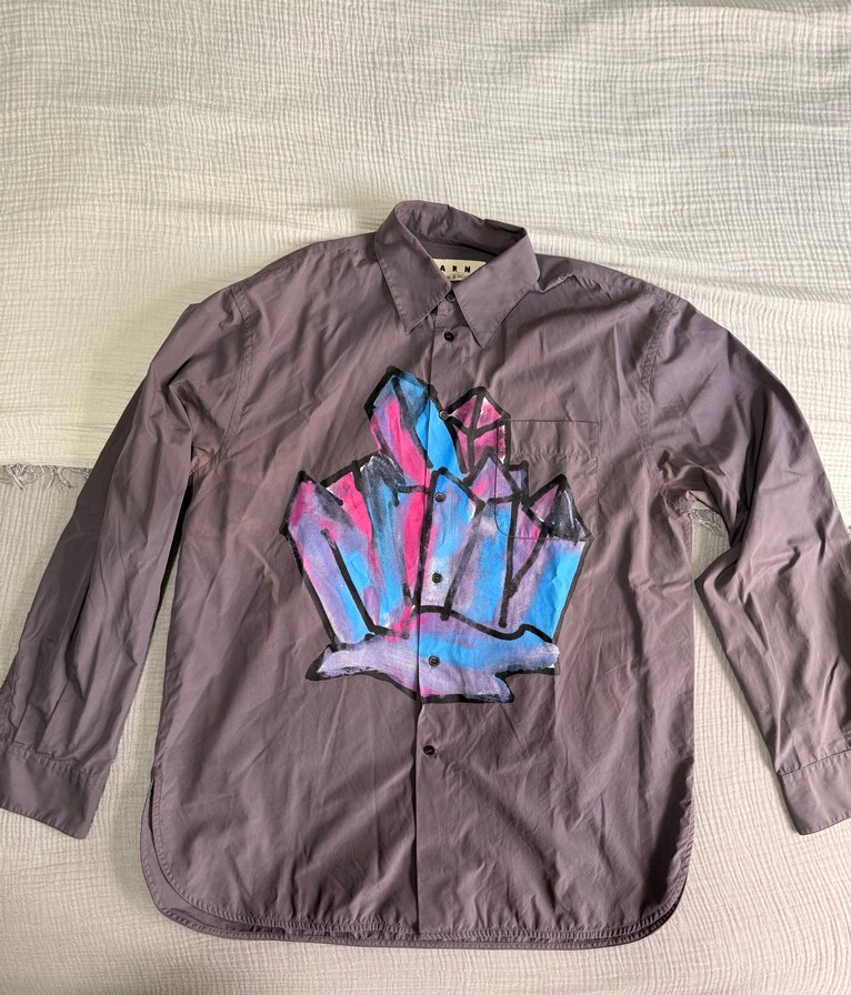 Mor renkli, uzun kollu, düğmeli ve yakalı gömlek. Ön kısmında baskılı desen vardır. Rahat ve bol kesim, günlük kullanıma uygundur. Oldukça şık ve markayı bilenler için efsane bir üründür. İki koltuk altı 60 cm boy 78 cm