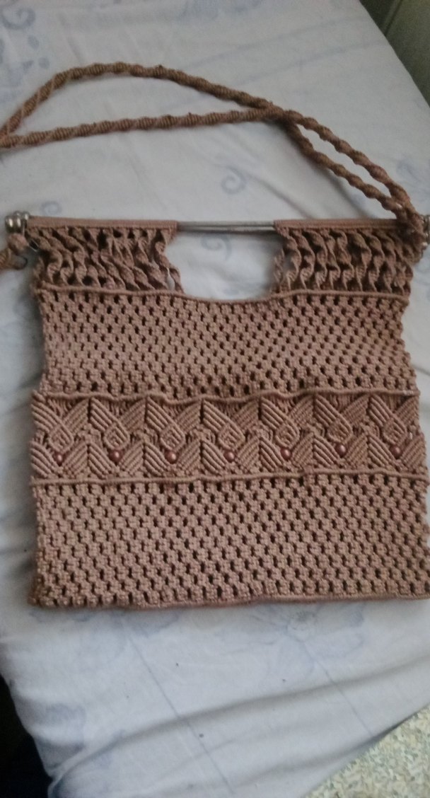 Detaylı desenli, örgü bej kadın çantası, örme askılı ve bohem tarzda, günlük kullanıma uygun.