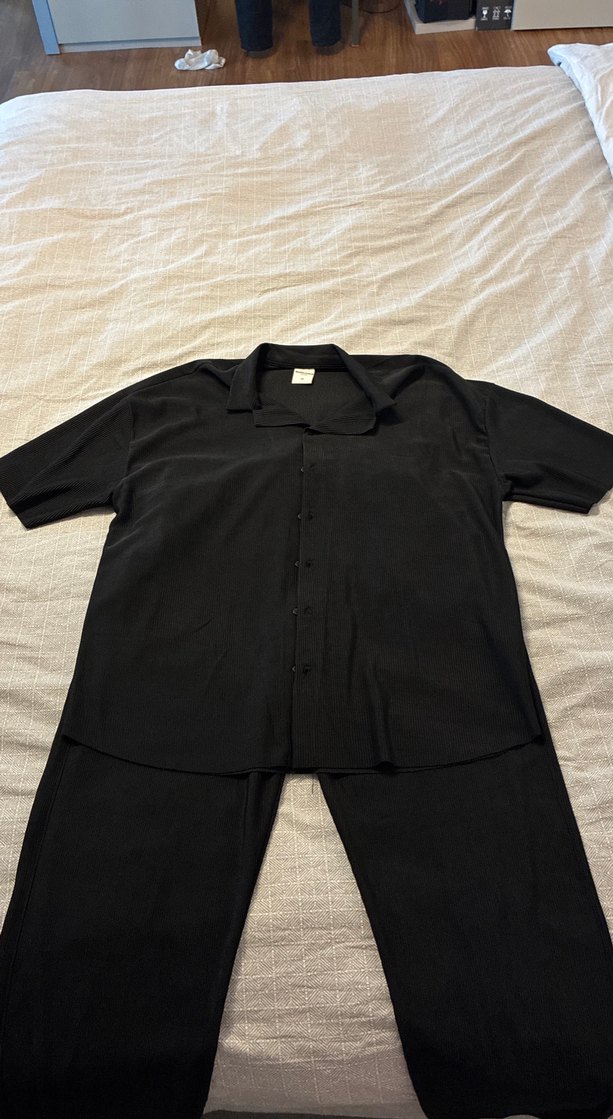 Bu erkek siyah gömlek, kısa kollu, düğmeli ve yakalıdır. İpeksi kumaştan üretilmiş, salaş kesim ve desen içermeyen minimalist tasarımdadır.