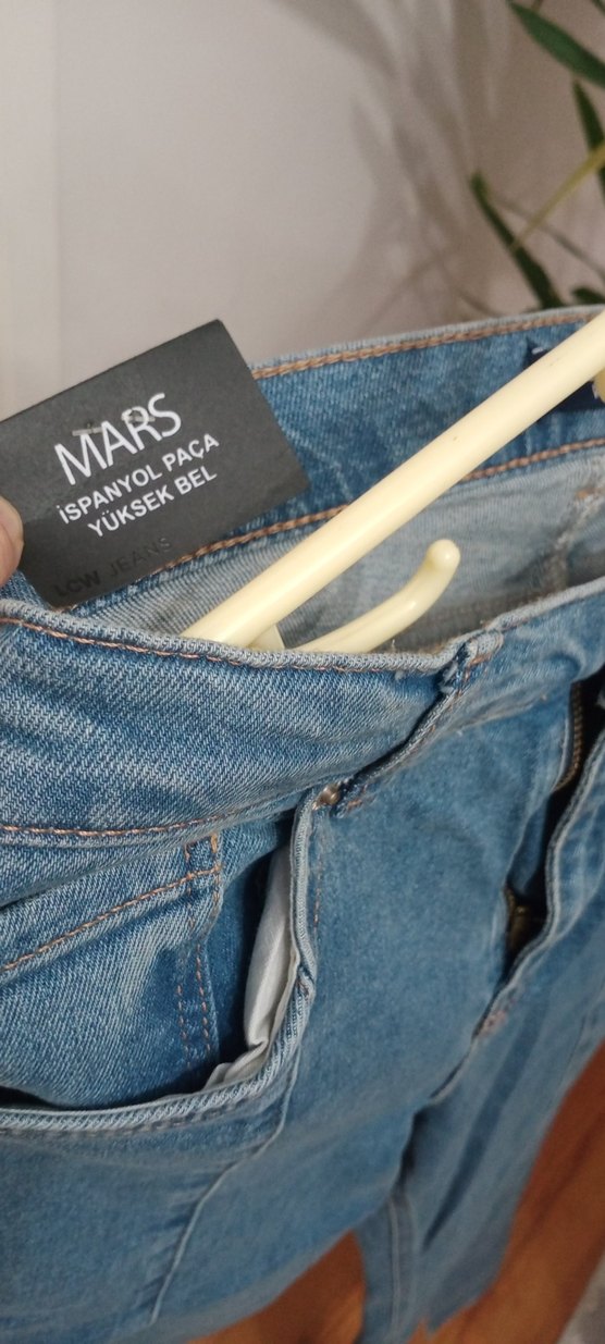 Mars markalı denim pantolon, yüksek bel ve ispanyol paça kesime sahip.gündelik sokak stili için uygundur.