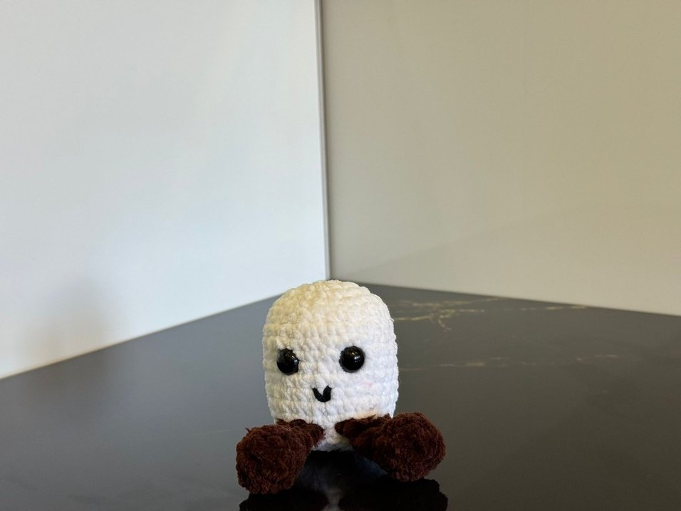 Yumuşak ve sevimli beyaz ve kahverengi peluş oyuncak, siyah gözlü, rahatlık ve dekorasyon için uygundur.
