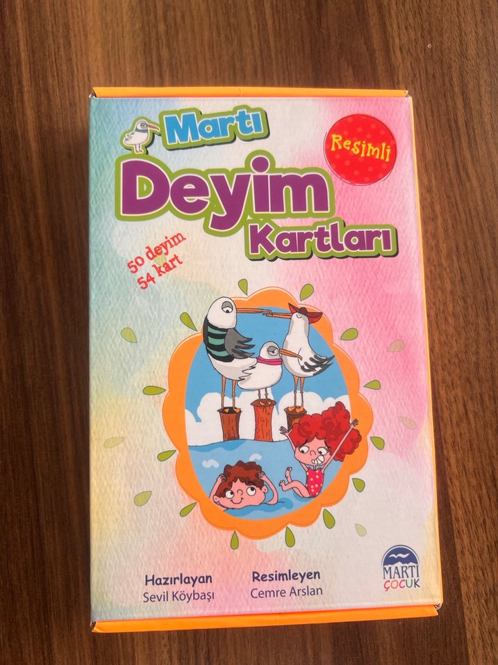 Martı Resimli Deyim Kartları, 54 kart ve 50 deyim içerir. Sevil Köybaşı tarafından hazırlanmış, Cemre Arslan tarafından resimlenmiştir.