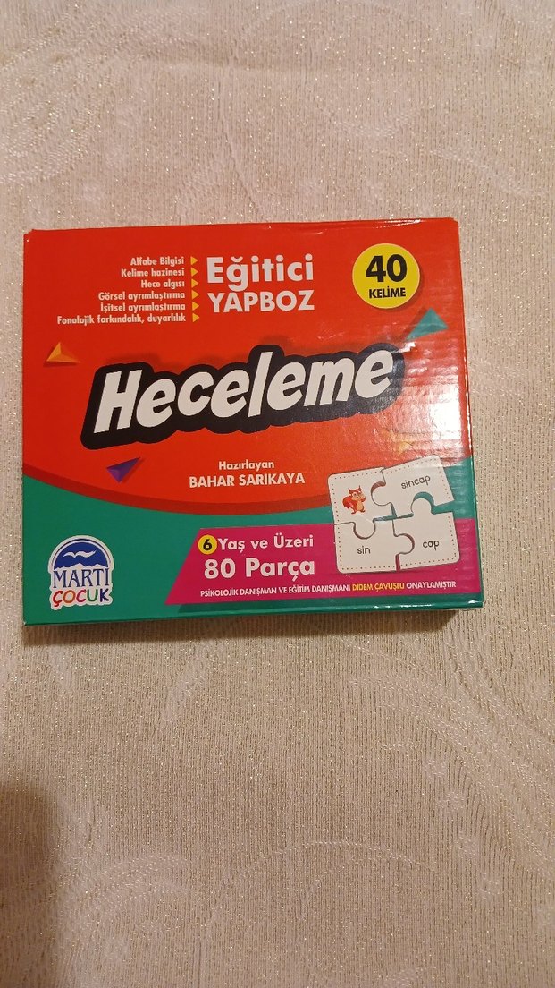 6 yaş ve üzeri çocuklar için 80 parçalı, 40 kelimelik heceleme eğitici yapboz. Görsel ve fonolojik farkındalık sağlar.