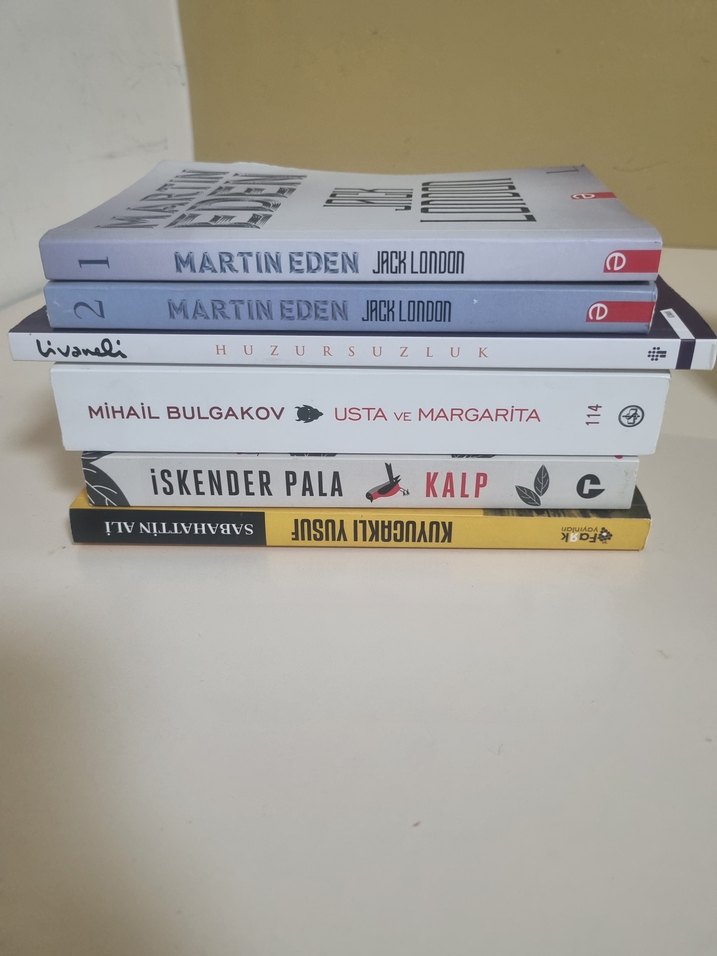 Jack London-Martin Eden Livaneli-Huzursuzluk Mihail Bulgakov-Usta ve Margarita İskender Pala-Kalp Sabahattin Ali-Kuyucaklı Yusuf Romanlardan almak istediğinizi bana belirtip öJack London-Martin Eden Livaneli-Huzursuzluk Mihail Bulgakov-Usta ve Margarita İskender Pala-Kalp Sabahattin Ali-Kuyucaklı Yusufyle alın lütfen. Eklediğim fiyat kitapların tekli fiyatıdır toplu değil. Toplu almak isteyen olursa makul bir fiyat için yazabilir. ♡♡