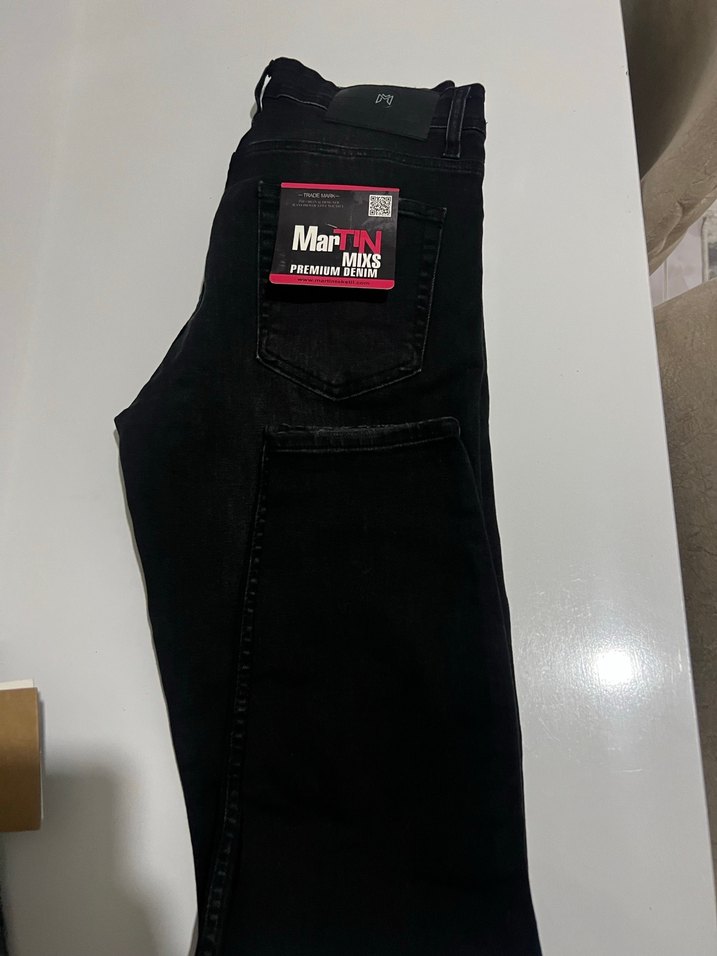 MarTIN markalı siyah regular fit erkek kot pantolon, baskılı etiketli ve kemerli tasarımlı. Günlük kullanıma uygun midi boyda, sokak stiline uygun.