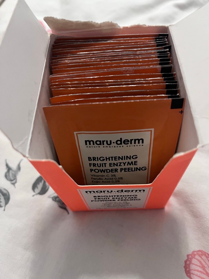 Maru Derm Parlatıcı Meyve Enzimli Toz Peeling, C vitamini ve AHA içeren nazik bir soyucu bakım sunar. 30lu paketin içerisinden ben sadece 6 paket kullandım 24 adet vardır içerisinde.