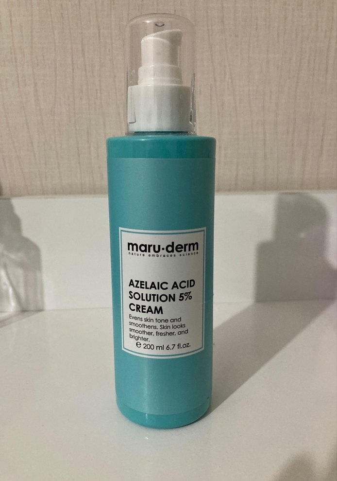 Maru-Derm Azelaik Asit Çözüm %5 krem, lekeleri azaltmaya yardımcı olur ve cildi kızarıklık ile tahrişten korur. 200 ml pompalı şişede sunulur. Yarısı dolu