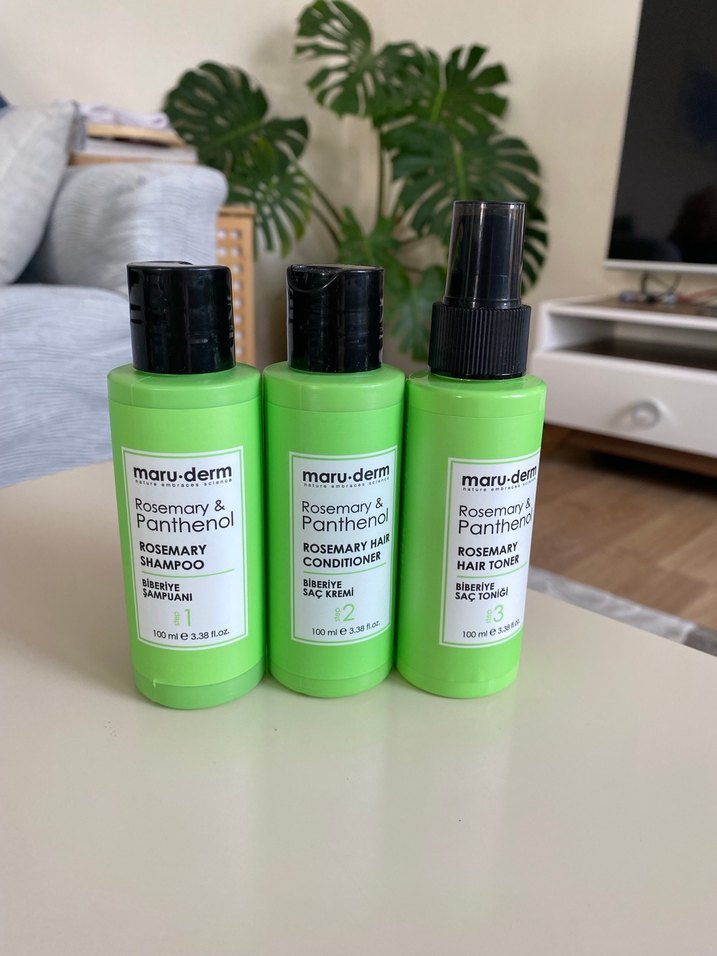 Maru-Derm Biberiye & Panthenol içeren şampuan, saç kremi ve saç toniği seti, doğal bileşenlerle saç bakımına destek olur.