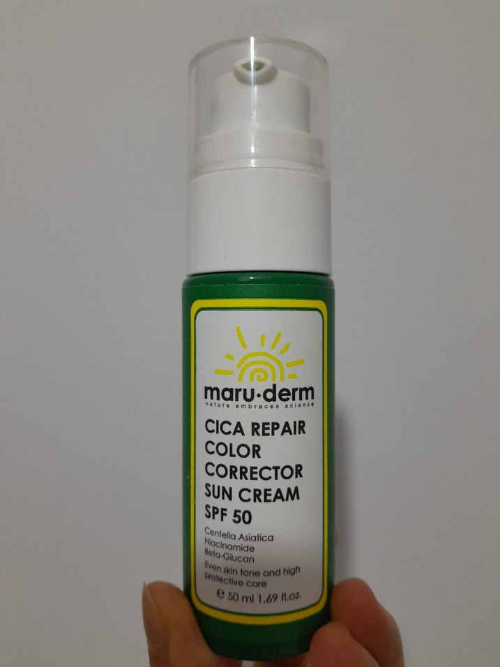 Maru.Derm Cica Repair Renk Düzeltici Güneş Kremi SPF 50, Centella Asiatica, Niacinamide ve Beta-Glukan içerir, cilt tonunu eşitler ve yüksek UV koruması sağlar.