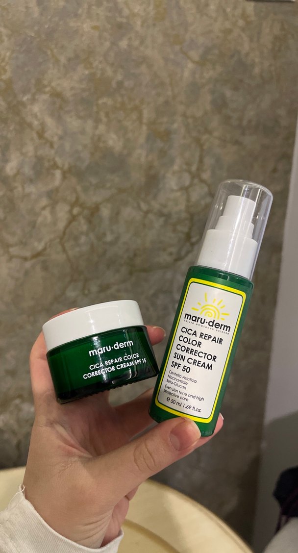 Maru-Derm Cica Repair renk düzeltici krem ve SPF 50 güneş kremi içerir. Cildi onarır, renk eşitliği sağlar ve yüksek koruma sunar. ☀️ 2si de 1 kez kullanıldı