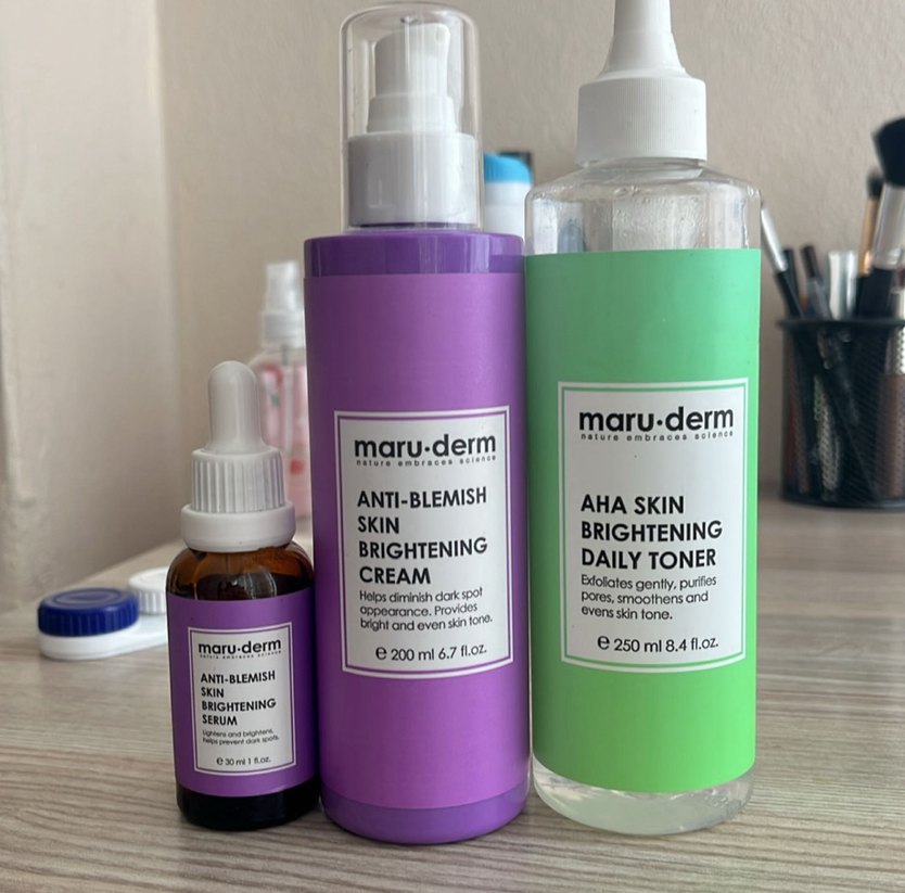 Maru-Derm set, leke karşıtı aydınlatıcı krem, serum ve AHA içeren günlük tonik içerir. Krem ve serum koyu lekeleri azaltır, tonik nazikçe ölü deriyi arındırır ve cilt tonunu eşitler. ✨Ürün görselde görünen kadar kullanılmıştır. Serumun %90 ı doludur.