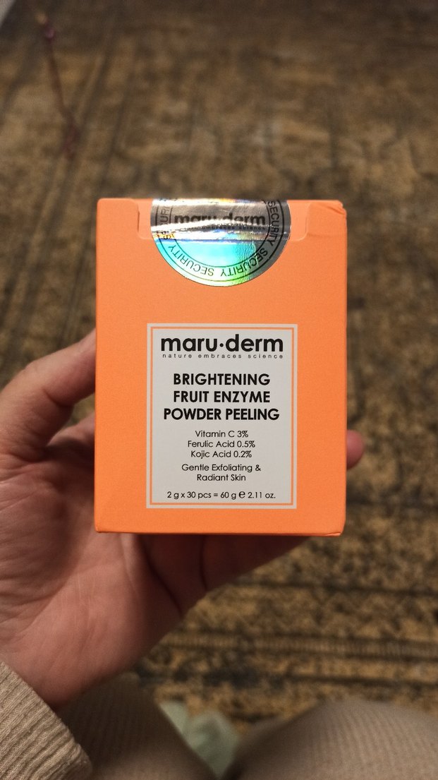 Maru.Derm Meyveli Enzimli Aydınlatıcı Toz Peeling, C vitamini %3, ferulik asit %0,5 ve kojik asit %0,2 içerir. Nazikçe eksfoliye eder, cildi aydınlatır. 30 adet 2g paket, toplam 60g. yeni sıfır ürün